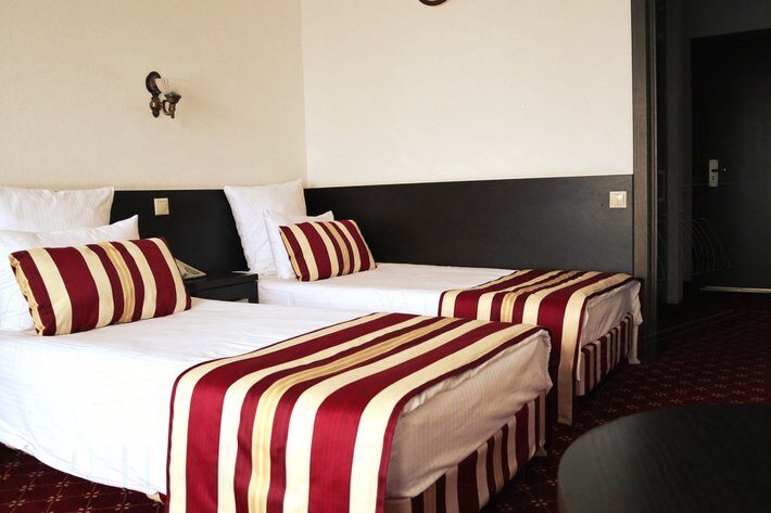 - С кроватями Вox spring. В номере 2 кровати по 80 см. По своей конструкции Box Spring может состоять из одного цельного двухспального блока или же из двух отдельных односпальных. Отсутствие бортиков по бокам кроватей позволяет сдвигать односпальные блоки и составлять двуспальные.